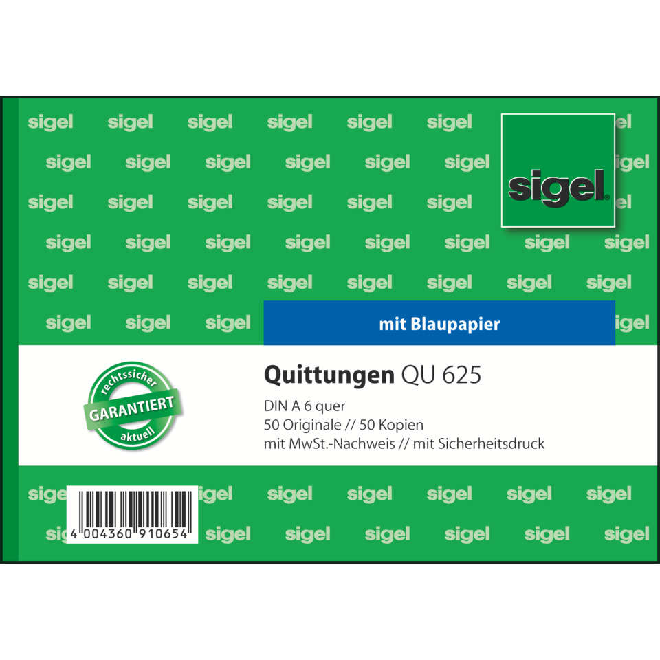 Quittungs-Formular mit einer Kopie, Format A6 quer, mit MwSt.-Nachweis. Fälschungssicherer Dokumentendruck. Original mit anwenderfreundlicher Abheftlochung und ultra-feiner Microperforation für leichtes und sauberes Abtrennen, die weiße Kopie ohne Perforation verbleibt zur Sicherheit im Buch. Formularbuch mit besonders haltbarer Spezial-Rückenleimung, inklusive Blaupapier.