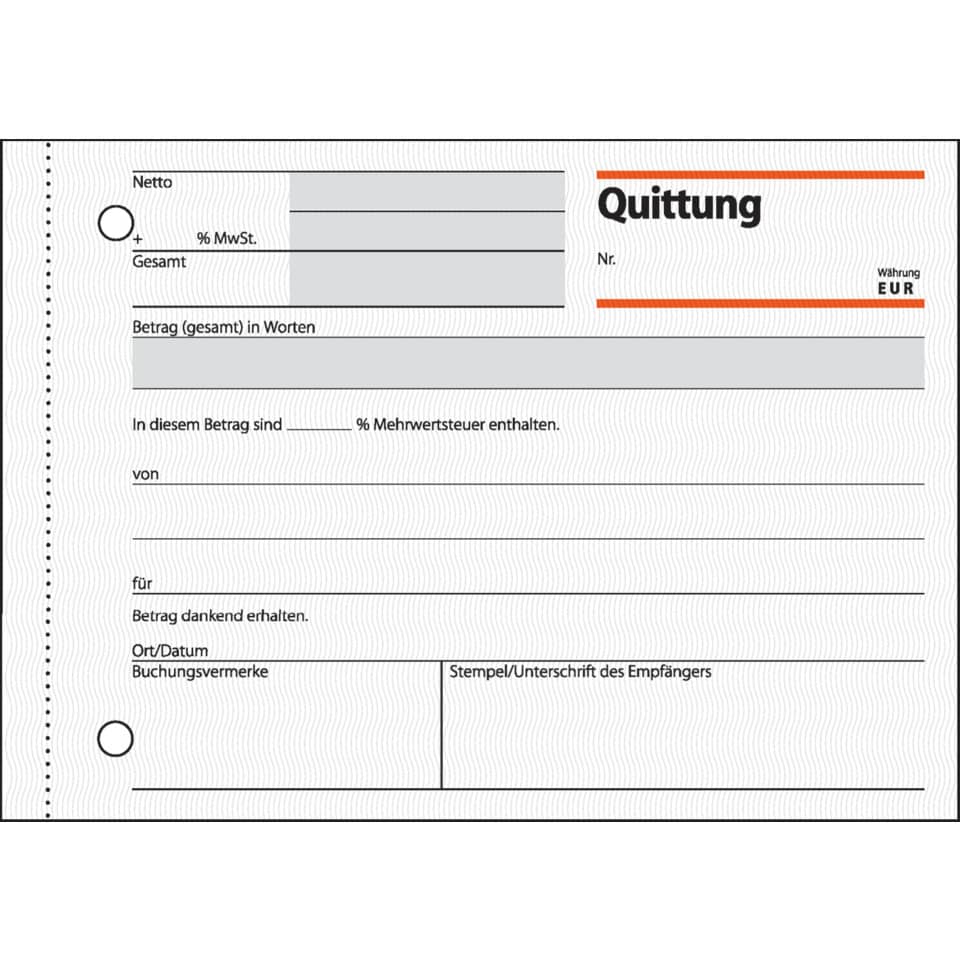 Quittungs-Formular, Format A6 quer, mit MwSt.-Nachweis. Fälschungssicherer Dokumentendruck. Besonders anwenderfreundlich: Jedes Blatt mit Abheftlochung und ultra-feiner Microperforation für leichtes und sauberes Abtrennen. Formularbuch mit besonders haltbarer Spezial-Rückenleimung, inklusive Blaupapier.
