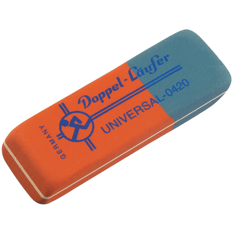 Der Klassiker aus dem Hause LÄUFER. Mittelweicher zweiseitiger Radierer. Die rote Seite radiert Blei-, Farb- und Kopierstifte, die blaue radiert Tinte, Tusche und Toner. Hergestellt aus Naturkautschuk.