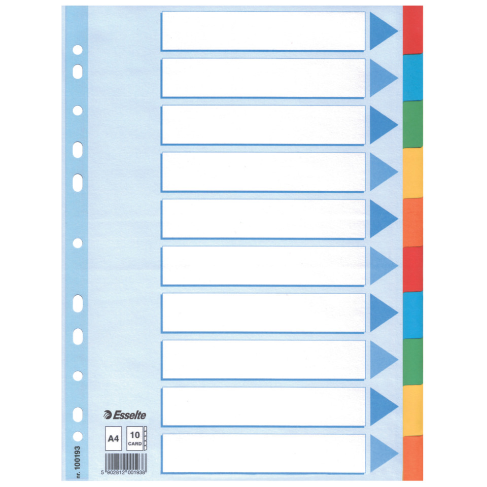 Esselte Register Blanko, Karton. Für Format A4. 10 Blatt Blanko. Mehrfarbig. Register in attraktiver Farbkombination aus Recyclingkarton und mit Blauem Engel. Deckblatt mit ausreichend Platz zur Beschriftung des Inhalts. Deckblatt mit folienverstärktem Lochrand. 10 farbige Taben für eine übersichtliche Organisation. Mit Universal-Lochung, für Format A4. Material: Recycling Pendarec-Karton 160 g/qm (RC). Zertifikate und Zulassungen: Blauer Engel.