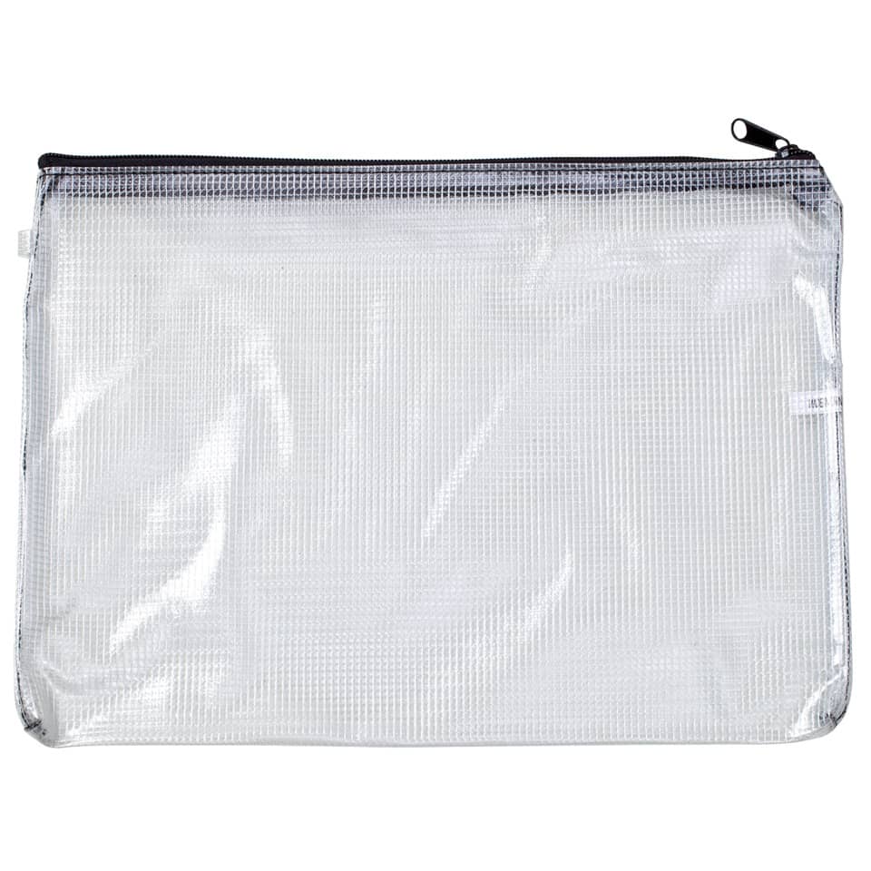 Transporttasche Mesh-bag, transparentem PVC mit Netzgewebe zum Transport von Bildern, Zeichnungen etc. Planschutzhülle mit obenliegendem Reißverschluß und Netzgewebe verstärkt – äußerst robust. Farbigen Rand: schwarz.