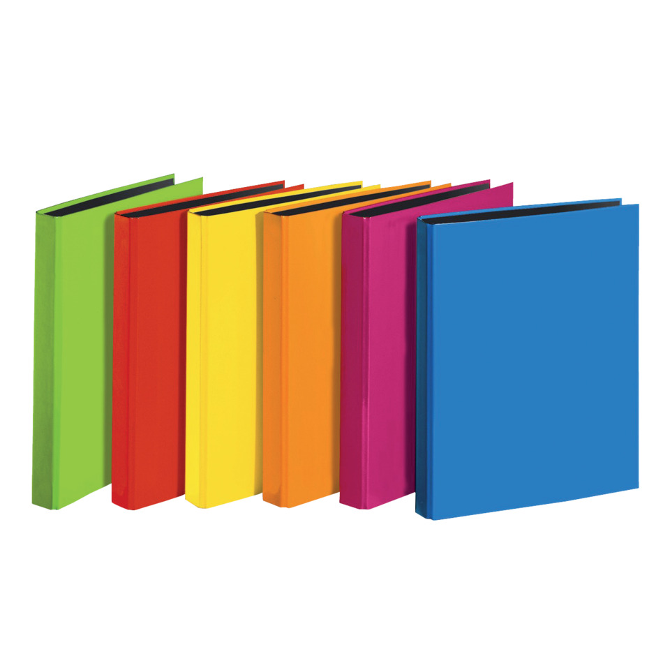 Ringbuch VELOCOLOR®, DIN A4 Größe 258x318x33, Karton glanzkaschiert schwarzer Innenspiegel, 4-D-Ring-Mechanik 25 mm Füllhöhe, passend für ca. 250 Blatt 80g Papier, sortiert in gelb, hellrot, orange, hellgrün, hellblau, pink