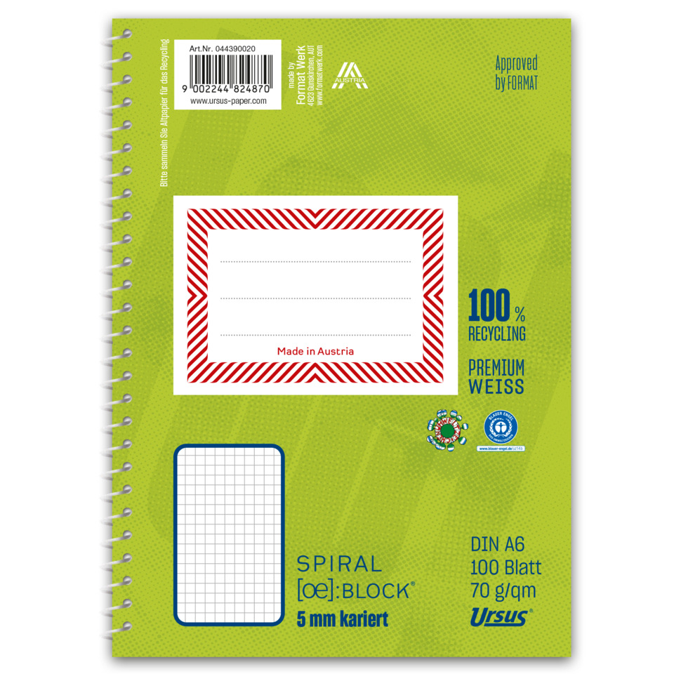 Das verantwortungsbewusste Produkt aus hochwertigem Schreibpapier 70 g/qm. 100 % Recycling: Papier vollständig aus recycelten Fasern hergestellt; premiumweißes Schreibpapier ohne optische Aufheller und ohne Chlorbleiche. Das Produkt ist mit den Umweltzeichen „Blauer Engel“, „Österreichisches Umweltzeichen“ und „Nordic Swan“ zertifiziert. Papierherstellungsprozess TÜV geprüft. Schullineaturen in blau, mit Spirale längsseitig,100 Blatt pro Block. Format: A6. Lineatur: 5 mm kariert.