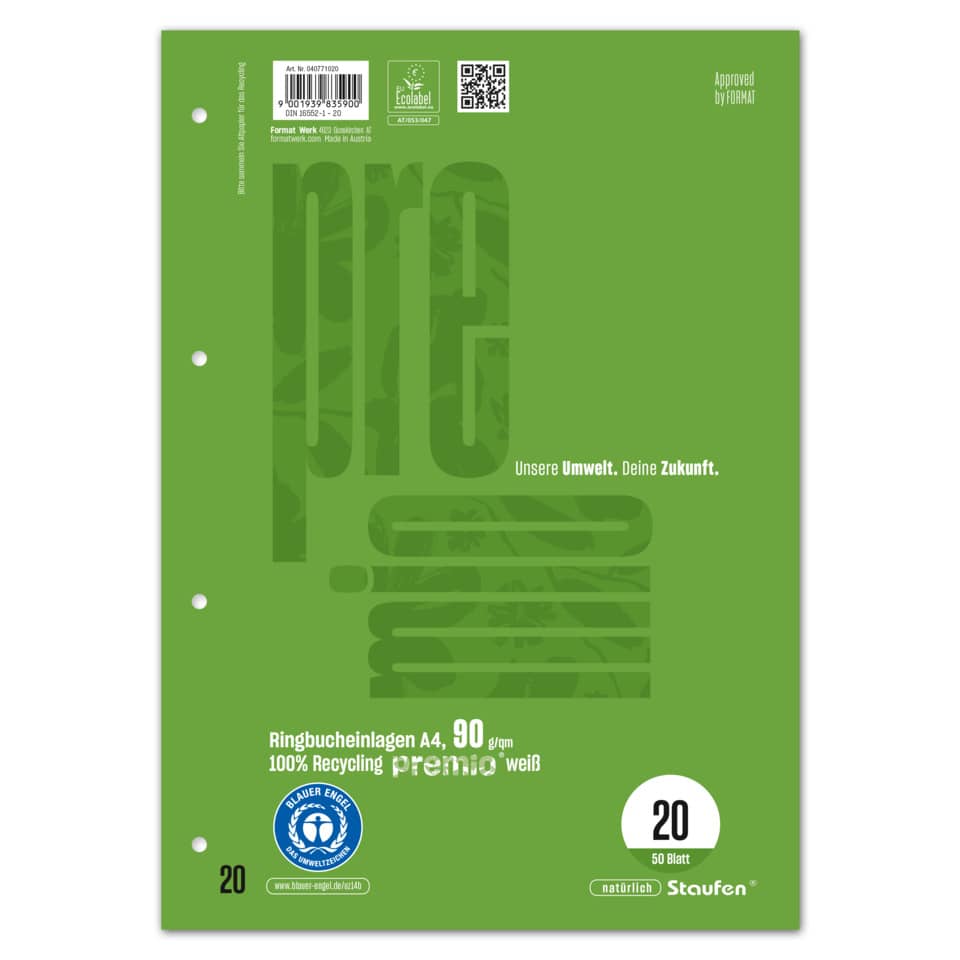 Ringbucheinlage Premio. 100% Recycling Pure Impact. 90 g/qm. Lochung: 4-fach. Papierformat: DIN A4 = 21,0 cm x 29,7 cm. Ausführung der Lineatur: blanko. Farbe: weiß. Anzahl der Blätter je Packung: 50 Blatt. Qualität mit dem Umwelt-Extra! Das exklusive premio® Sortiment wird aus 100% recycletem Papier unter den strengen Auflagen des Blauen Engels und des EU Ecolabels hergestellt. Die erstklassige Beschaffenheit und das hochweiße 90 Gramm Papier sorgen für ein angenehmes Schreibgefühl und eine herausragende Opazität. Geschützt wird jedes Produkt durch Deckblätter bzw. Umschläge mit hoher Grammatur, im eleganten Design der modernen permio® Farbenwelt. premio® ist DER umweltfreundliche Begleiter in Schule und Büro.