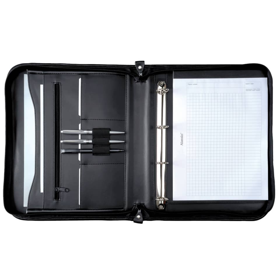 Ob Schule, Studium oder Büro – die übersichtliche Alassio® Ringbuchmappe »Limone« erweist sich als treuer Begleiter. Die Dokumentenmappe mit Reißverschluss im A4-Format überzeugt durch eine übersichtliche Aufteilung und großzügigen Stauraum. Einschubfach für einen A4 Schreibblock, ein zweites darunter liegendes Fach, drei Einsteckfächer, drei elastische Stiftschlaufen, dehnbare Fächertasche auf der linken Seite, Visitenkartenfächer und Reißverschlussfächer sorgen für Ordnung und bieten Platz für alles, was stets griffbereit sein muss. Die Dokumentenmappe ist zudem mit einer herausnehmbaren Ringmechanik, Ring-Ø 20 mm, ausgestattet. Die Ringbuchmappe aus Kunstleder besticht mit einem eleganten und zeitlosen Design. Hält Unterlagen schnell griffbereit. Größe: 360 x 40 x 285 mm. Lieferung ohne Inhalt.