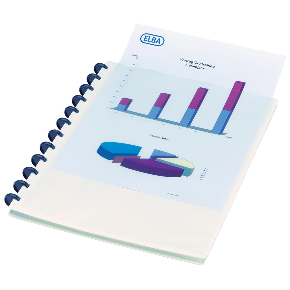Ringmappe mit 20 glasklaren Hüllen, zusätzlich erweiterbar um ca. 40 Hüllen, schnelle Änderung der Reihenfolge durch vario-zipp inside. Vorderflügel mit glasklarer Tasche zur individuellen Frontseitengestaltung. Nachträglich erweiterbar mit blendfreien Hüllen 74 420, glasklaren Hüllen 74 430, Visitenkartenhüllen 61 467 und kariertem Papier 61 439. Beschriftungsmöglichkeit mit ELBA print. Blaues vario-zipp inside Logo. Sichttasche auf Vorderdeckel, Hüllen oben offen, Ring-Ø: 19 mm, Ringfarbe: schwarz. Einband aus PP. Rückenbreite: 20 mm. Für A4. Größe: 235 x 310 mm (B x H).