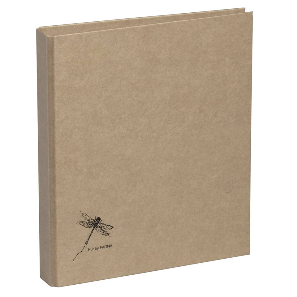 Ringbuch Pur für Dokumente im Format A5. Farbe: natur. Einband aus stabilem Graukarton (RC) mit recycelbarem Kraftpapier überzogen. Mit praktischer 2-Ring-Mechanik zur sicheren Ablage gelochter Unterlagen. Mit dezenter schwarzer Prägung einer Libelle.