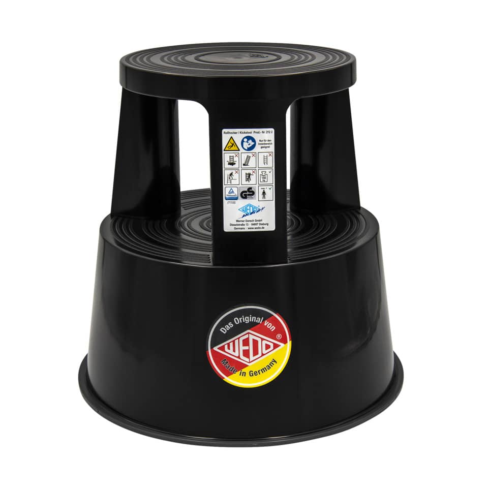 WEDO® Rollhocker STEP, schwarz (RAL 9005) aus bruchfestem, wiederverwertbarem Kunststoff, kinderleicht zusammensteckbar. Werkzeuge sind nicht erforderlich. Superleicht beweglich durch drei auf Stahlfedern gelagerte Gleitrollen. Bei Belastung steht er unverrückbar fest auf seinem integrierten Gummistandring. TÜV- und GS-geprüft nach EN 14183-F. Höhe unbelastet ca. 43,0 cm, Höhe belastet ca. 42,5 cm, Durchmesser oben ca. 29,0 cm, unten ca. 44,0 cm. Tragkraft 150 kg.