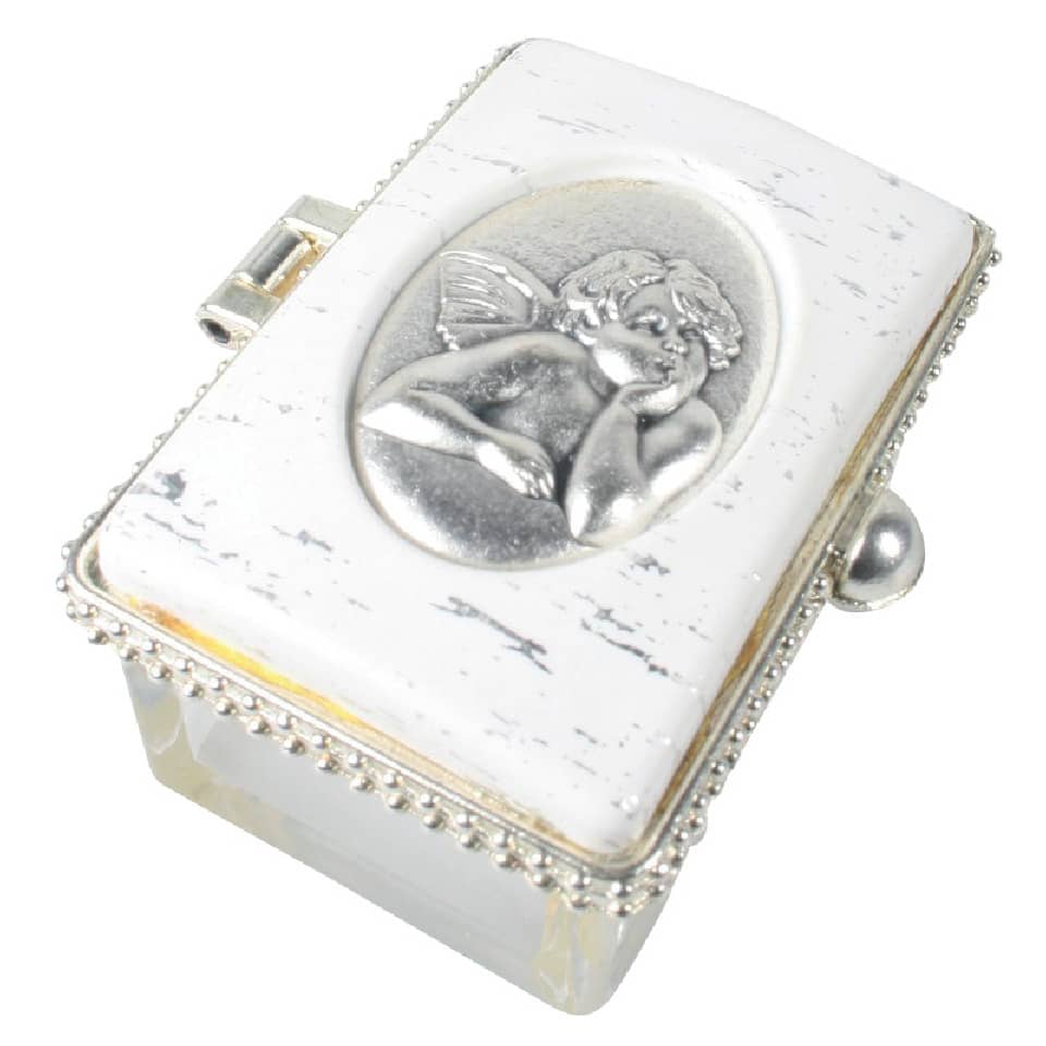Rosenkranzdose Engel – eckig, transparent mit weißem Klappdeckel. Motiv: Engel. Maße: 5 x 3 x 3 cm.