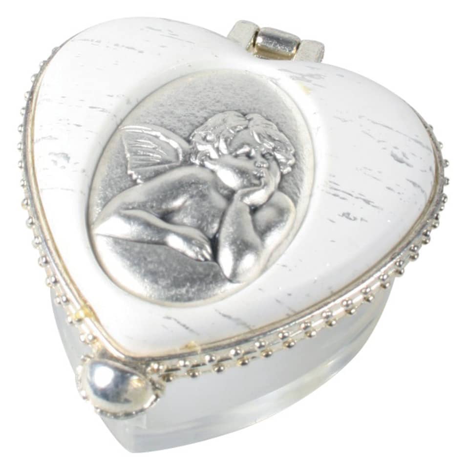 Rosenkranzdose Engel – herzförmig, transparent mit weißem Klappdeckel. Motiv: Engel. Maße: 4 x 3 cm.