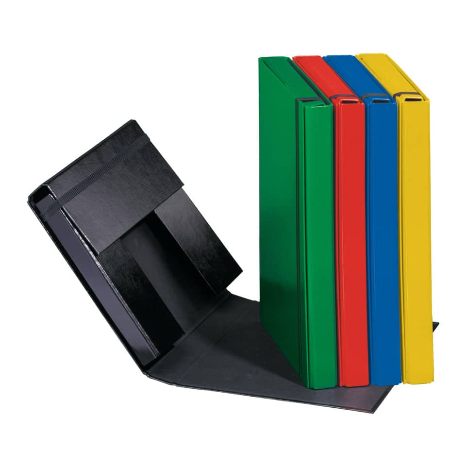 Sammelbox für Dokumente im Format A4. Basic in schwarz einfarbig mit schmutzabweisender Laminierung und zusätzlichem Gummizugverschluss zum Aufbewahren und Transportieren loser Unterlagen.