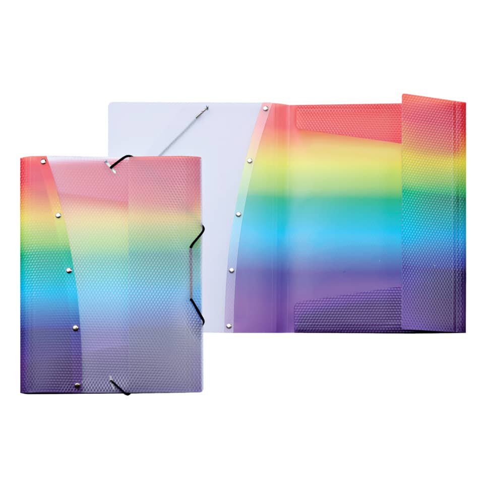 Sammelmappe Diamond Rainbow. Geprägtes PP-Material, zweifarbig verarbeitet. 3 Klappen (Jurisklappen) am Unterdeckel vorhanden. Art des Verschlusses: Gummizug. Werkstoff: PP. Verwendung für Papierformate: A4. Größe (B x H): 230 x 315 mm. Farbe: bunt.