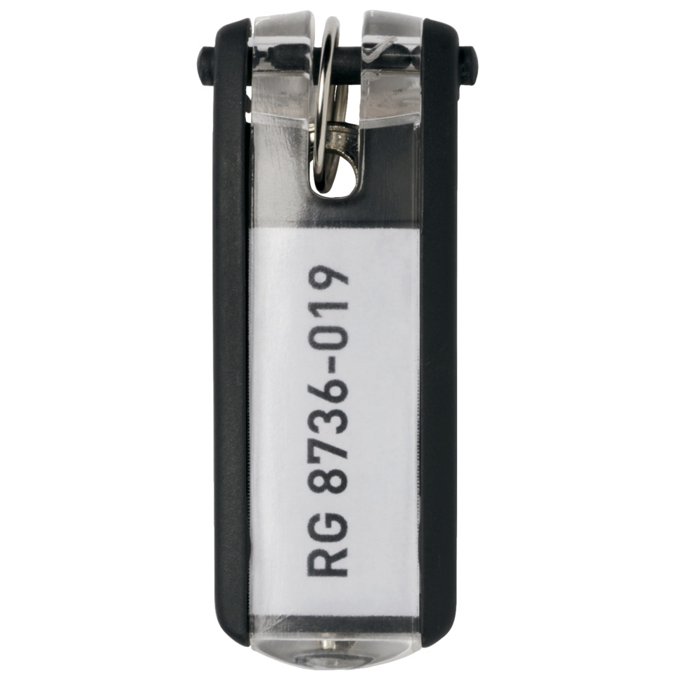 DURABLE Schlüsselanhänger KEY CLIP, schwarz. Schlüsselanhänger mit permanent sichtbarem Beschriftungsfeld. Schlüssel liegt flach dahinter. Beschriftungsfeld leicht zu öffnen, ohne Abnehmen des Schlüsselrings. Passend für alle Schlüsselkästen KEY BOX, Schlüsselbrett KEY BOARD und Schlüsselleiste KEY RAIL. Aus hochwertigem Kunststoff. Maße des Clip (B x H): 69 x 29 mm. Maße des Einsteckschildes (B x H): 40 x 17 mm. Packungsinhalt: 6 Stück. Zusatz: Kostenfreier Download der Formatvorlagen