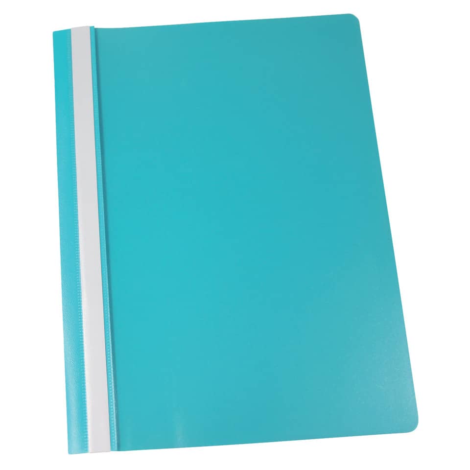Kunststoffschnellhefter für A4, Vorderdeckel transparent genarbt 120 mµ, farbiger Rückendeckel 190 mµ, mit Beschriftungsstreifen. BxH: 23,0 x 31,0cm mit 160g, Maße Metallzunge in mm: 5 x 145 mm, Gelenksstärke: 160 mµ, Maße Schnellhefter geöffnet: 460 mm x 310 mm.