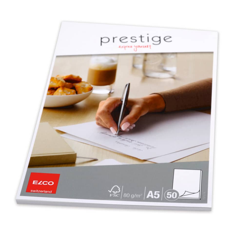 Schreibblock ELCO Prestige. Werkstoff: Papier. Flächenmasse des Papiers: 80 q/qm. Mit Lösch- und Linienblatt. Papierformat: DIN A5. Ausführung der Lineatur: blanko. Farbe: weiß. Anzahl der Blätter: 50 Stück.