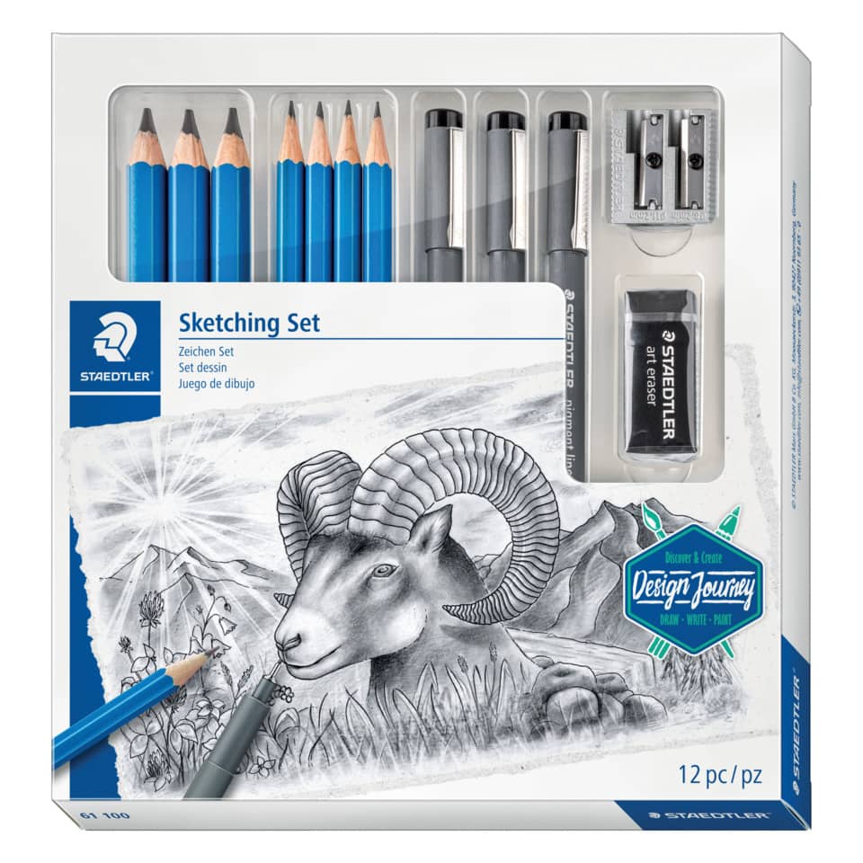 Schreibgeräteset Sketching Set – 100% PEFC. 12 Schreibgeräte. Ausführung des Inhalts mit Packung: Kartonetui mit Stiften, Spitzer und Radierer. Typbezeichnung der Schreibgeräte: Je 1x 100- HB, -H, -2H, -4H, 100J-8B, -6B, -4B, -je 1 x 308 03-9, 308 05-9, 308 10-9, 1 x 526 B30-9C, 1 x Doppellochspitzer. Material des Schaftes: Holz/Kunststoff. Ausführung Clip: metall, silber. Beschreibung der Besonderheiten: 7 Bleistifte, 3 Pigmentliner, 1 Radierer und 1 Spitzer. Farbe des Schaftes: blau/grau.