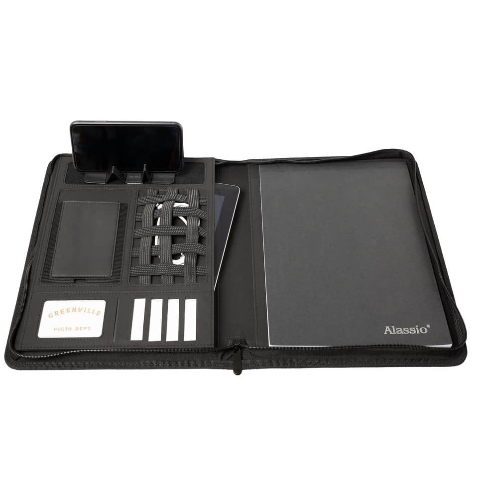 Reißverschlussmappe, Schreibmappe, Dokumentenmappe für A4 hoch hergestellt aus recyceltem PET Polyethylen Kunststoffmaterial. 1 Einsteckfach, 1 Dokumentenfach, flexible Multifunktionsbänder zur Fixierung verschiedener Gegenstände, 1 flexibles Einsteckfach, 1 Tabletfach, 1 Handy-/Tabletaufsteller, 5 Kredit-/ Visitenkartenfächer, 1 Notizblock A4. Farbe: anthrazit. Innengröße aufgeklappt: ca. 33 x 52 cm. Gewicht ca. 0,7 kilo. Außengröße ca. 33,5 x 26,5 x 4 cm.