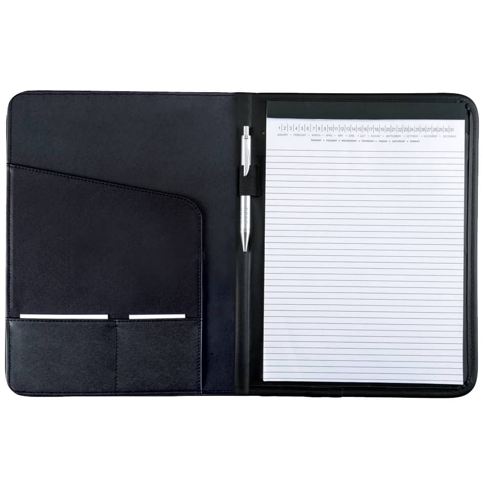 Praktische A4 Schreibmappe mit umrandeter Ziernaht. Zur Unterbringung Ihrer A4 Dokumente befindet sich innen ein Einschubfach. Außerdem verfügt die Mappe über eine Stiftschlaufe sowie einem integriertem Schreibblock. Größe: 240 x 15 x 310 mm.