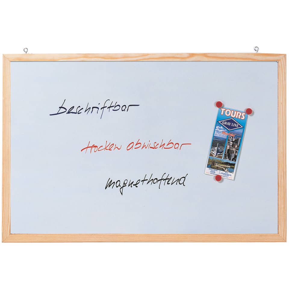 Gut und günstig: Der Bestseller unter den Klassikern! Einfache Schreibtafel mit naturbelassenem Rahmen aus Kiefernholz zum Anheften Ihrer Memos und Infos. Die Oberfläche ist magnethaftend, beschriftbar und trocken abwischbar. Sie ist ideal als Magnetboard und für kurzfristige Notizen durch FRANKEN Tafelschreiber mit alkoholgelöster Tinte geeignet. Die Montage ist einfach, problemlos und kann wahlweise im Hoch- oder Querformat erfolgen. Oberflächenbeschaffenheit: lackiert. Material des Rahmens: Holz. Farbe des Rahmens: natur. Zubehör für Wandbefestigung: Wandbefestigung. Größe (B x H): 60 x 40 cm. Farbe: weiß.