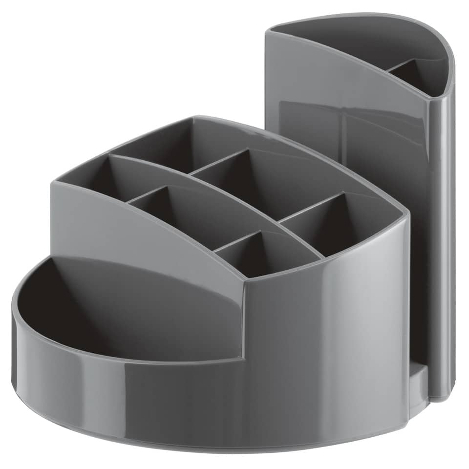 Schreibtischköcher RONDO. Klare Linienführung vereint mit hochwertiger Verarbeitung in Hochglanz und funktionellem Design: durchdacht, dynamisch und elegant. 9 Fächer inkl. praktischem Brief- und Kartenschlitz. In diesem Stifteköcher finden Ihre Stifte und Büroutensilien schnell einen Platz und sind immer griffbereit. Standfest und stabil. Rutschfest durch möbelschonende Gummifüße. Made in Germany. Außenmaße (B x T x H): 140 x 140 x 109 mm. Material: hochwertiger Kunststoff, Polystyrol (PS). Farbe: dunkelgrau.