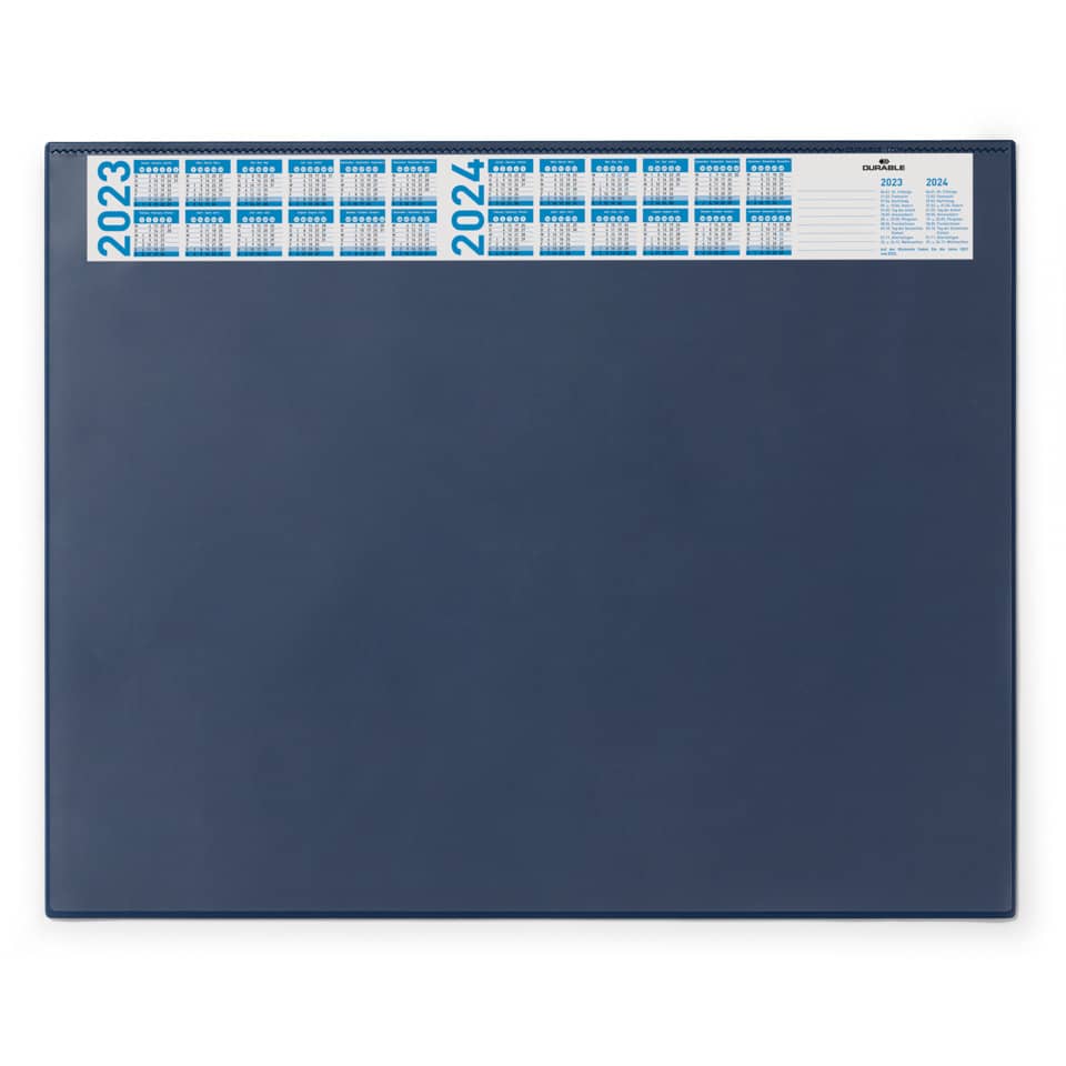 Schreibunterlage mit Jahreskalender. Ausführung: PVC. Folienauflage vorhanden. Rutschfest, dreisprachig: Deutsch, Englisch, Französisch, mit Angabe der gesetzlichen Feiertage, Langfristig aktuell: Kalender für 4 Jahre (Vor- und Rückseite). Größe (B x H): 650 x 520 mm. Stärke: 2 mm. Farbe: dunkelblau.