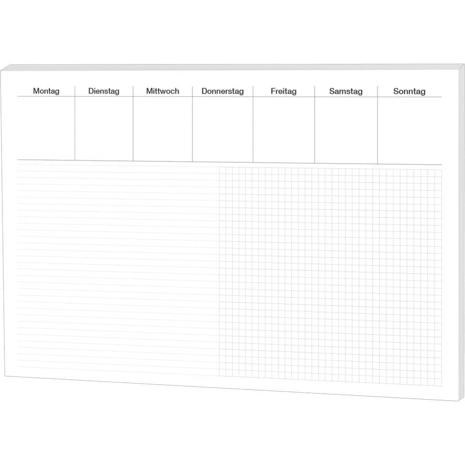 Auf der Notiz Schreibunterlage aus Papier ist viel Platz für Notizen aller Art. Es stehen 7 Wochentagsfelder und ein großes allgemeines Notizfeld zur Verfügung. Der hellgraue Hintergrund mit weißen Linien strengt die Augen weniger an und lenkt die Konzentration auf das Wesentliche. Die Linien sind beim Kopieren und Scannen kaum zu sehen.