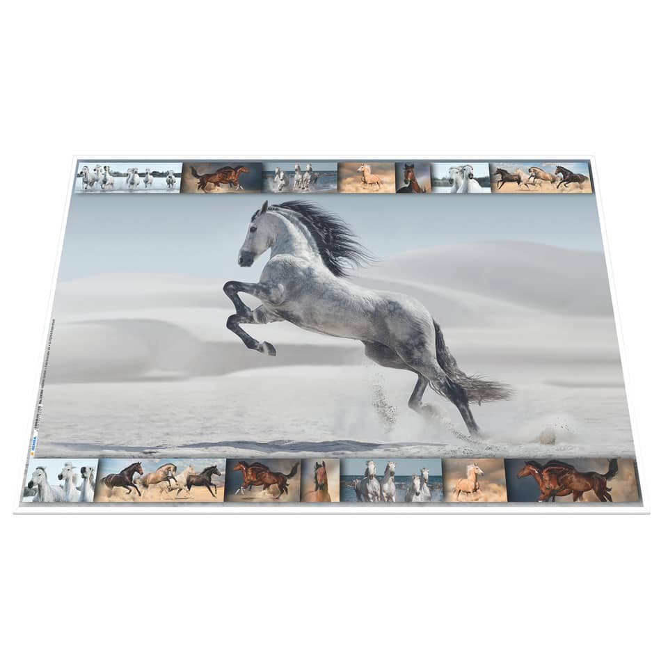 Bunte Schreibunterlage aus stabilem Karton, hochwertiger Farbdruck mit actiongeladenem Pferdemotiv. Vorder- und Rückseite vollflächig bedruckt. Besondere Haptik durch Softtouch-Folie, dadurch rutschfest. Ideal beidseitig verwendbar als Bastel-, Knet- oder Schreibtischunterlage.