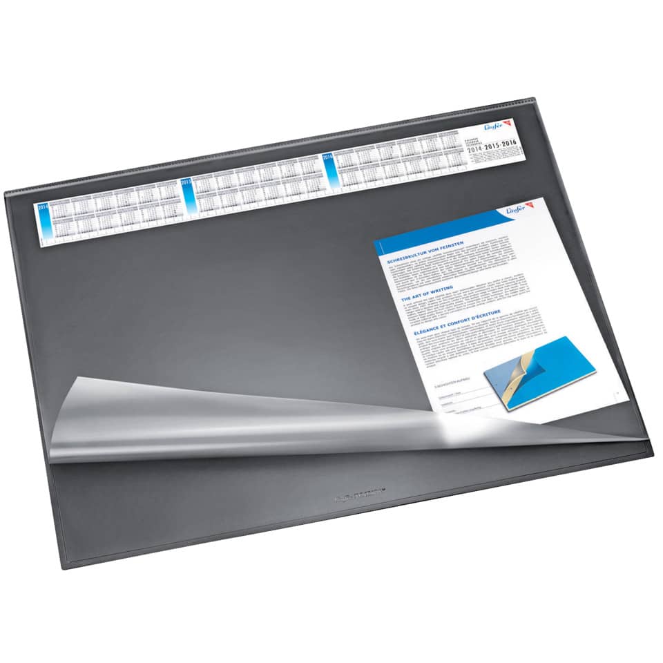 Schreibunterlage SYNTHOS VSP, schwarzer Kunststoff, rückseitige Kunstschaumbeschichtung, 3-Schichten Aufbau, hohe Rutschfestigkeit, mittlere Trägerschicht aus Recycling-Material, transparente Vollsichtfolie, abwaschbar, rutschfest, recycelbar, auswechselbarem 3-Jahreskalender . Aus recyclingfähigem Kunststoff.