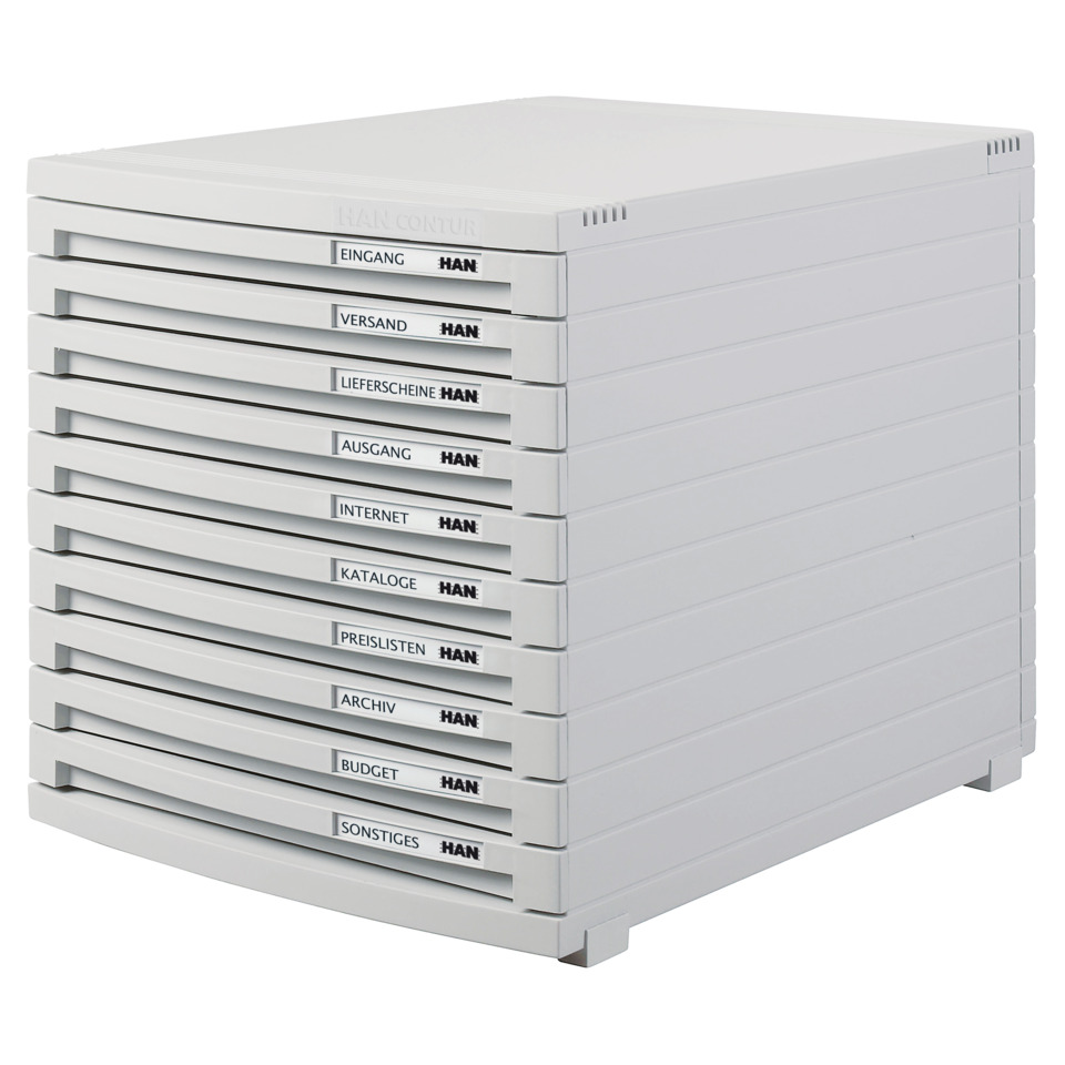 Schubladenbox CONTUR mit 10 geschlossenen Schubladen für Formate DIN A4/B4/C4. DIN A4 – Formate werden durch separate Begrenzungsstege perfekt gehalten. Etabliertes Design in harmonischer Optik. Leichtlaufende, flache Schubladen auf besonders stabilen Führungen mit Auszugssperre und Griffloch für ein bequemes Entnehmen. Inkl. Beschriftungsschilder und Begrenzungsstege. Hohe und flache Schubladen sind nach Bedarfsvolumen untereinander austauschbar. Dank der innovativen und patentierten Steckverbindung lassen sich beliebig viele Elemente individuell miteinander zu einer hervorragenden Organisationslösung verbinden. Enorme Stabilität garantiert. Weiteres Zubehör optional erhältlich. Made in Germany. Außenmaße (B x T x H): 300 x 382 x 307 mm. Innenmaße der Schubladen (B x T x H): 254 x 355 x 20 mm, daher ein hohes Fassungsvolumen. Material: hochwertiger Kunststoff, Polystyrol (PS). Farbe des Gehäuses: lichtgrau. Farbe der Schubladen: lichtgrau.