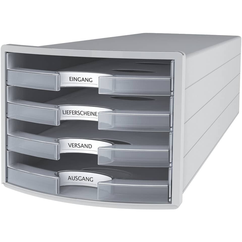 Schubladenbox IMPULS mit neuem, modernen Gehäusedesign mit 4 offenen, großzügigen Schubladen für Papierformate DIN A4/C4. Innovatives, attraktives Design in höchster Qualität. Inkl. großer auswechselbarer Beschriftungsschilder mit hochwertiger Klarsichtabdeckung für ein einfaches Auffinden von Unterlagen. Leichtlaufende Schubladen mit Auszugssperre und durchgängig geschlossenem Boden auch zur Kleinteile Organisation geeignet. Extra stabile Gehäuseausführung mit optimierter Stapeltechnik. Rutschfeste, möbelschonende Gummifüße sorgen für einen sicheren Stand. Made in Germany. Außenmaße (B x H x T): 280 x 235 x 367 mm. Innenmaße der Schubladen (B x H x T): 240 x 25 x 325 mm, daher ein hohes Fassungsvolumen. Material: hochwertiger Kunststoff, Polystyrol (PS). Farbe des Gehäuses: lichtgrau. Farbe der Schubladen: transluzent-klar.