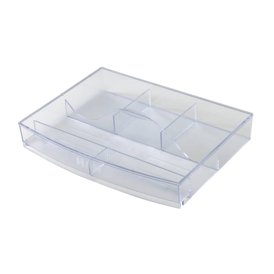 Innovativer Schubladeneinsatz mit 6 unterschiedlich großen Fächern und Griff, der auch perfekt auf die Box mit der integrierten Stapelrippe gestellt werden kann. Design in höchster Qualität. Ob Stifte, Haftnotizen, Textmarker, Büroklammern und weitere Kleinutensilien finden im Einsatz schnell einen Platz und sind immer griffbereit. Sorgt für Ordnung in Ihrer Schubladenbox, auf dem Schreibtisch oder auch in der Schreibtisch-Schublade. Dank des integrierten Griffes lässt sich der Schubladeneinsatz überall hin mitnehmen. Flexibel einsetzbar, alles ist übersichtlich in der Schublade verstaut. Ideal als Einlage oder Auflage. Passt perfekt in die HAN Schubladenboxen IMPULS, Schrankset/Systembox und CONTUR (Art.-Nr. HAN 1012, 1013, 10128, 1401, 14018, 1450, 14508, 1503 und 1505). Die kompakten Abmessungen ermöglichen auch einen Einsatz in anderen Schubladen mit den entsprechenden Maßen. Made in Germany. Außenmaße (B x T x H): 237 x 180 x 40 mm inkl. Griff. Innenmaß des Einsatzes (B x T x H): 230 x 174 x 38 mm. Material: hochwertiger Kunststoff, Polystyrol (PS). Farbe: transparent-glasklar.