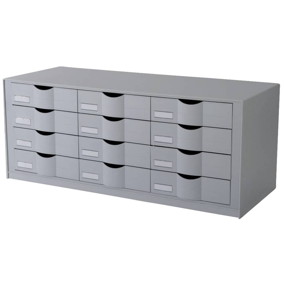 Aus schlag- und kratzfestem Polystyrol hergestsellt und einsatzbereit geliefert. 12 Schübe für Format 24 x 32 cm. Lieferung mit Etiketten und -haltern.