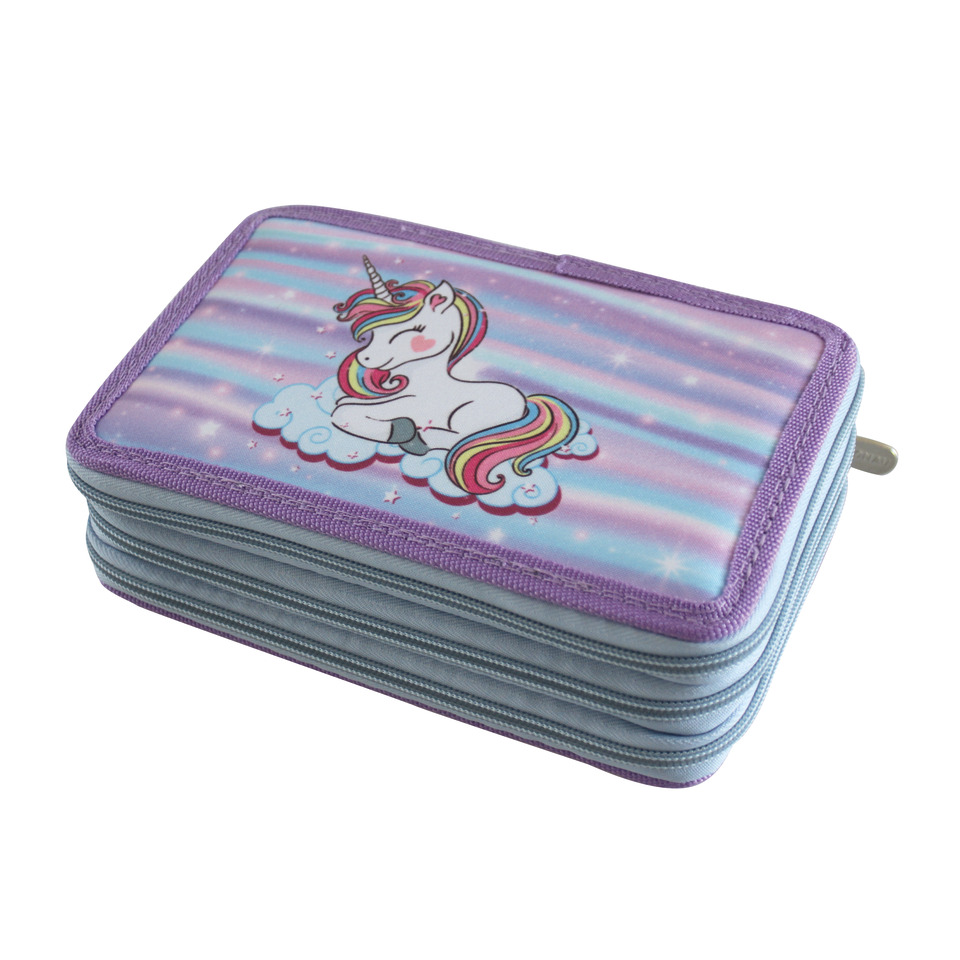 Dieses praktische 3-Stock-Etui aus strapazierfähigem Polyester ist perfekt für die Schule. Es ist komplett gefüllt und verfügt über eine eingenähte kleine Tasche für Kleinigkeiten. Mit 43 Teilen bietet es alles, was man braucht: 1 Radierer, 1 Spitzer, 3 Bleistifte, 1 Lineal, 1 Stundenplan, 18 Fasermaler und 18 Farbstifte. Maße (BxHxT): 200 x 60 x 130 mm.