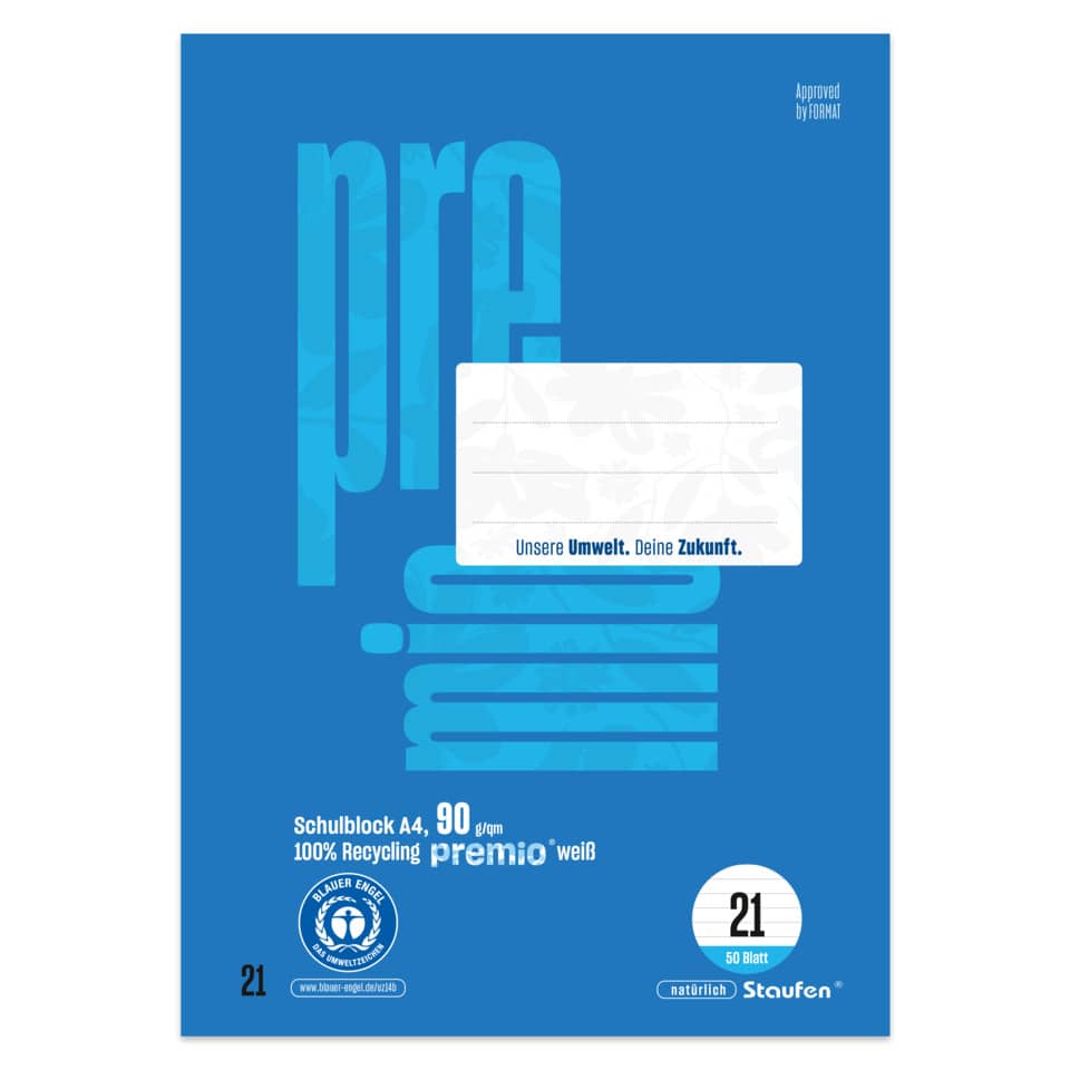Qualität mit dem Umwelt-Extra! Das exklusive premio® Sortiment wird aus 100% recycletem Papier unter den strengen Auflagen des Blauen Engels und des EU Ecolabels hergestellt. Die erstklassige Beschaffenheit und das hochweiße 90 Gramm Papier sorgen für ein angenehmes Schreibgefühl und eine herausragende Opazität. Geschützt wird jedes Produkt durch Deckblätter bzw. Umschläge mit hoher Grammatur, im eleganten Design der modernen permio® Farbenwelt. premio® ist DER umweltfreundliche Begleiter in Schule und Büro.