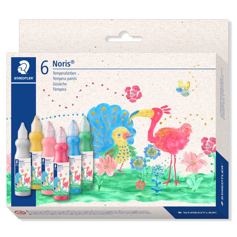 Staedtler® Noris® Temperafarbe. Kartonschachtel mit 6 Metallic-Farben. Hoch pigmentierte Temperafarben in ergonomischen Dosierflaschen á 75 ml. Metallic-schimmernde Farben mit hoher Deckkraft. Farben: Gold, Kupfer, Metallic rosé, Metallic grün, Metallic flieder, Metallic eiskristallblau. CE konform.