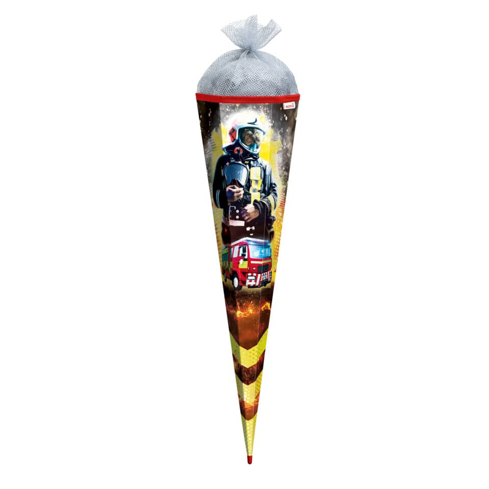 Ein Feuerwehrmann kämpft gegen die Flammen und das Einsatzfahrzeug steht schon bereit: Diese Schultüte steht im Zeichen des Notrufs 112! Die Zuckertüte ist 85 cm groß, eckig und mit Silbertüll verschlossen. Die Rot(h)e-Spitze verleiht der Schultüte die benötigte Stabilität. Der Folieneffekt rundet die abenteuerlustige Schultüte ab. Die kleinen Kinder werden begeistert sein und die Großen ebenso.