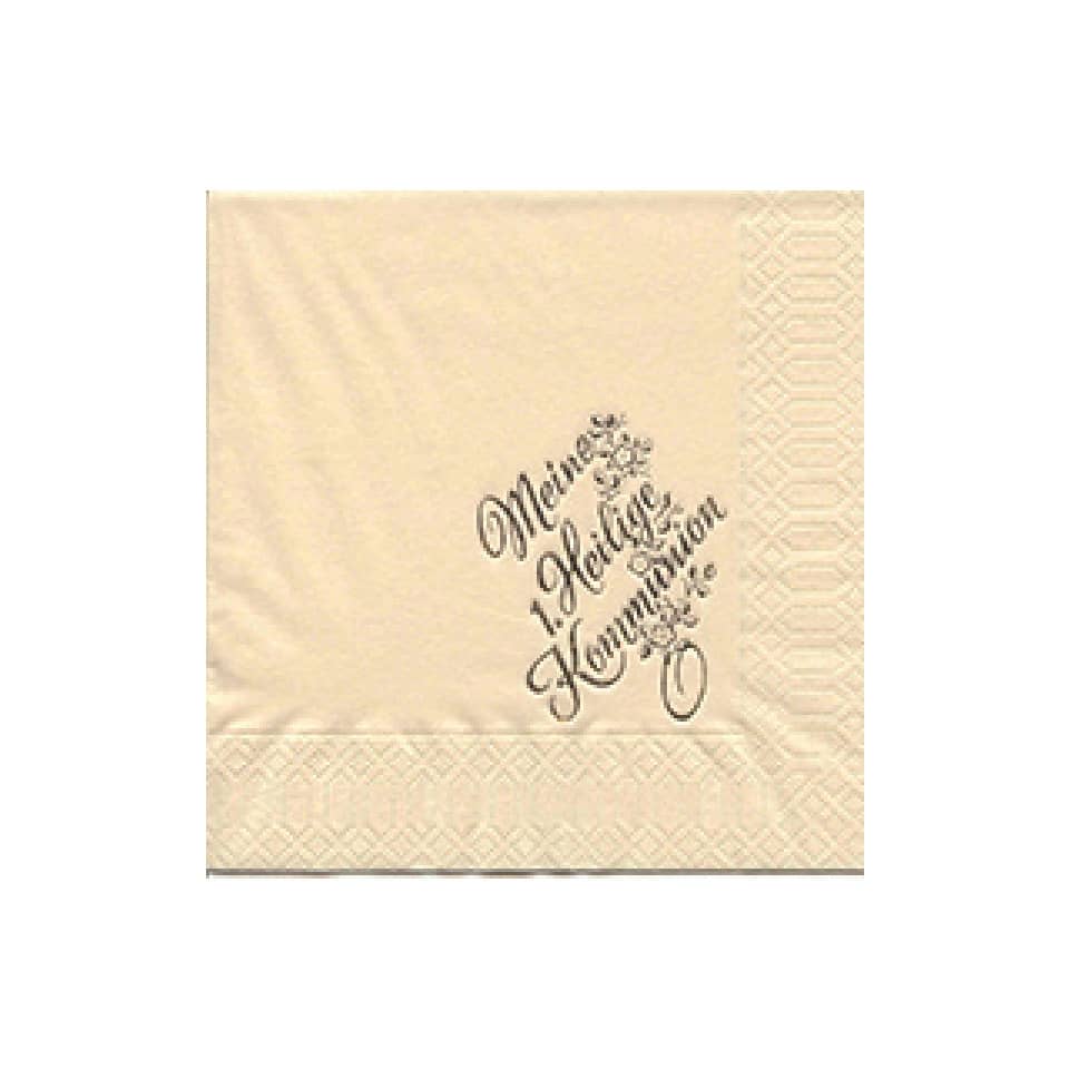 Servietten aus hochwertigem Zelltuch mit filigraner Folienprägung. 3-lagig, geprägt, 1/4-Falzung. Größe: 33 x 33 cm. Text: Meine 1. heilige Kommunion.