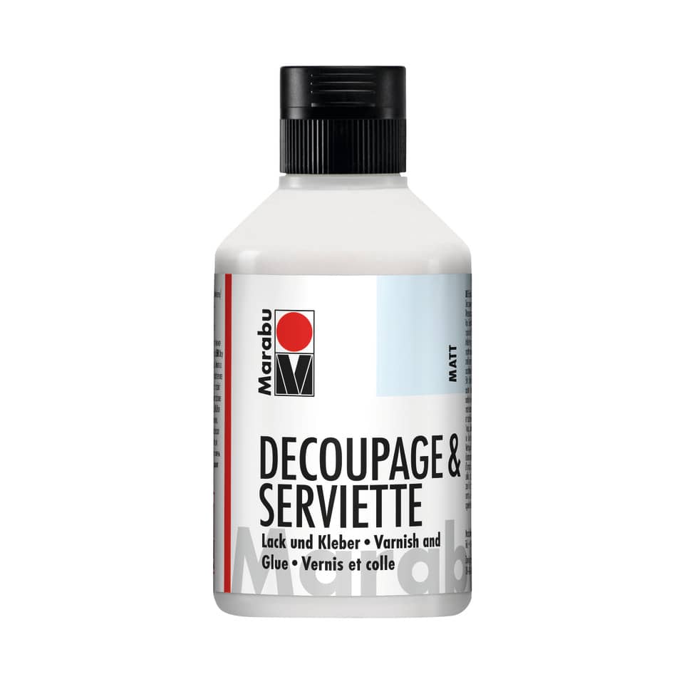 Serviettenlack. Anleitung Grundtechnik:1. Gegenstand mit Marabu Decormatt Acryl oder Marabu Decorlack Acryl grundieren.2. Serviettenmotiv ausschneiden, die oberste Schicht ablösen und auf die getrocknete Grundierung legen.3. Das ganze Motiv samt Hintergrund mit Marabu-Servietten-Lack & Kleber lackieren. Dabei von der Motivmitte zum Rand hin streichen. Trocknen lassen, fertig!