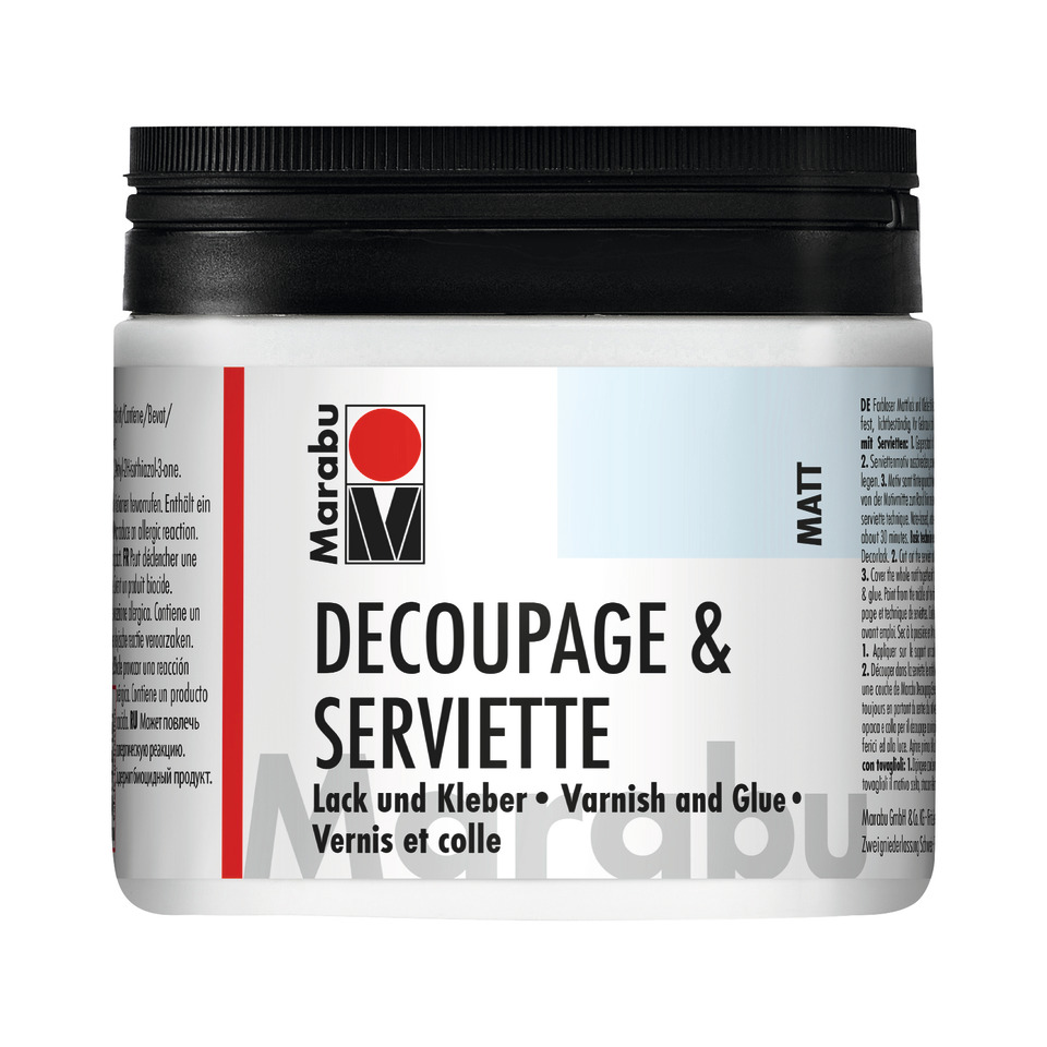 Serviettenlack. Anleitung Grundtechnik:1. Gegenstand mit Marabu Decormatt Acryl oder Marabu Decorlack Acryl grundieren.2. Serviettenmotiv ausschneiden, die oberste Schicht ablösen und auf die getrocknete Grundierung legen.3. Das ganze Motiv samt Hintergrund mit Marabu-Servietten-Lack & Kleber lackieren. Dabei von der Motivmitte zum Rand hin streichen. Trocknen lassen, fertig!