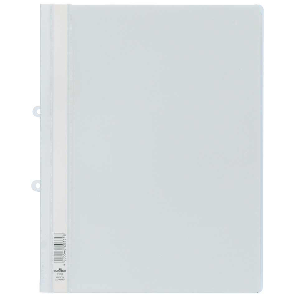 DURABLE Sichthefter mit Abheftschieber, weiß. Für Format A4 Überbreite. Auch zum Abheften von Prospekthüllen geeignet. Mit seitlichem Beschriftungsstreifen. Transparenter Vorder- und farbiger Rückendeckel mit Heftmechanik. Inkl. Abheftschieber zur Ablage in Ordnern und Ringbüchern. Nachrüstbar mit Hängeschiene Art.-Nr.: 1531.