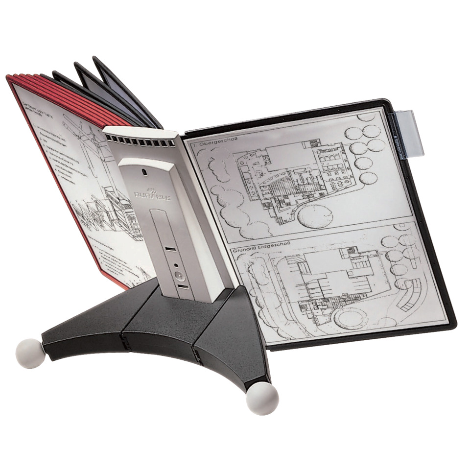 DURABLE Sichttafelsystem SHERPA® TABLE 10 mit farbigem Profilrahmen und Kunststoffreiter inkl. Blanko-Einsteckschildern. Tischständer mit 10 SHERPA® Sichttafeln im Format A4 (je 5 Stück in rot und schwarz). Produktdetails: Zusatz: Komplettsets bestehend aus einem Modultischständer und SHERPA® Sichttafeln für DIN A4 Informationen sowie Reitern mit blanko Einsteckschildern. Besonders rutsch- und standfest. Aneinanderreihen mehrerer Modultischständer durch Steckverbindung möglich. Schwerer Fuß aus glasfaserverstärktem Polyamid (PA). Farbe Ständer: anthrazit/grau. Erweiterbar auf bis zu 100 Tafeln. Größe: 420 x 275 x 305 mm (B x T x H).