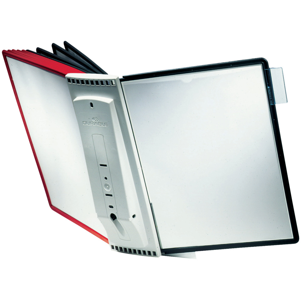 DURABLE Sichttafelsystem SHERPA® WALL 10. Wandhalter mit 10 SHERPA® Sichttafeln im Format A4 (je 5 Stück in rot und schwarz) sowie Reitern mit blanko Einsteckschildern. Kombinierbar mit Tischstativ Art.-Nr.: 5627. Produktdetails: Zusatz: Komplettsets bestehend aus einem Wandhalter und SHERPA® Sichttafeln im Format A4. Für Büro-, Empfang-, Verkaufs-, Ausstellungsräume etc.. Einfache Wandmontage. Aneinanderreihen mehrerer Module in beliebiger Anzahl möglich.