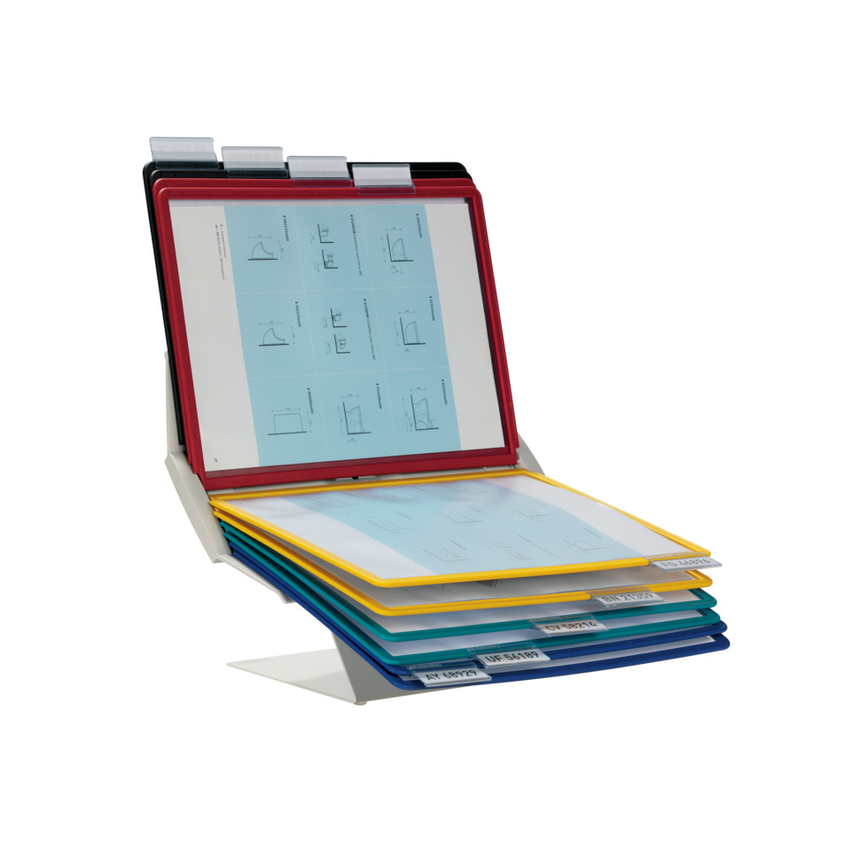 DURABLE Sichttafelsystem VARIO® PRO 10, farbig sortiert. Multifunktionales Sichttafel-System aus pulverbeschichtetem Stahlblech mit 10 SHERPA® Sichttafeln und Reitern mit blanko Einsteckschildern. Als Tisch- oder Wandanwendung und durch 90° Drehung des Tafelträgers im Hoch- oder Querformat einsetzbar. Tischständer/Wandhalter mit 10 SHERPA® Sicht-tafeln im Format A4 (je 2 Stück in schwarz, rot, gelb, grün und dunkelblau).