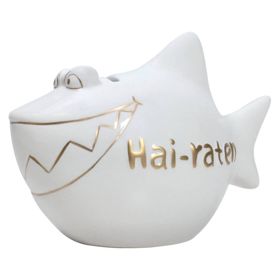 Wenn Sie mal ein nicht alltägliches Hochzeitsgeschenk brauchen, das ist diese Hai Spardose Hai-Raten bestimmt genau das richtige. Die Spardose hat einen Gumminoppen und unten Softpads.