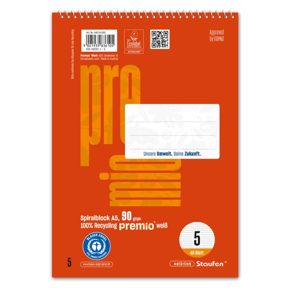 Qualität mit dem Umwelt-Extra! Das exklusive premio® Sortiment wird aus 100% recycletem Papier unter den strengen Auflagen des Blauen Engels und des EU Ecolabels hergestellt. Die erstklassige Beschaffenheit und das hochweiße 90 Gramm Papier sorgen für ein angenehmes Schreibgefühl und eine herausragende Opazität. Geschützt wird jedes Produkt durch Deckblätter bzw. Umschläge mit hoher Grammatur, im eleganten Design der modernen permio® Farbenwelt. premio® ist DER umweltfreundliche Begleiter in Schule und Büro.