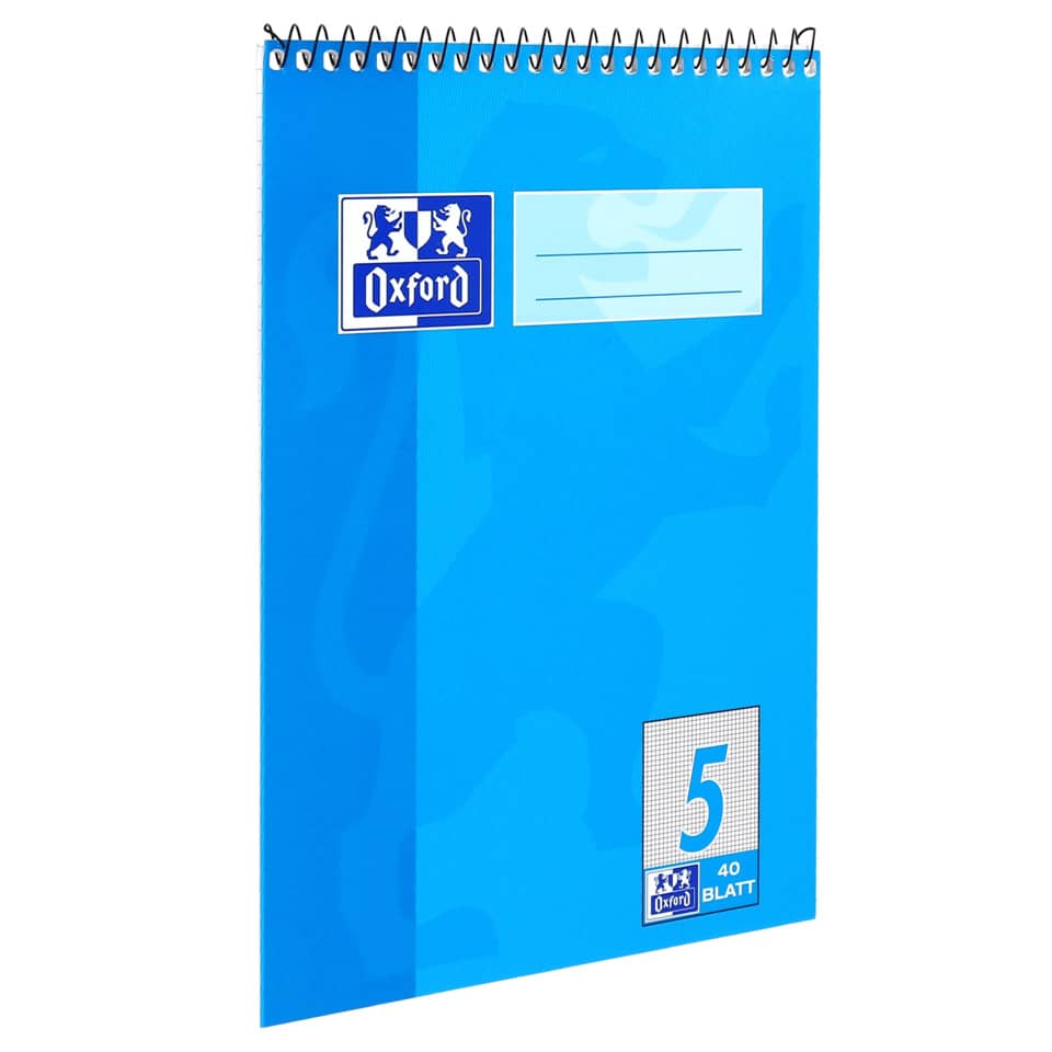 Schulblock. Bindung (Art): Kopfspirale. Perforiert. Optik Paper 90 g/qm. Format: A5. Lineatur: 5 – 5 mm kariert, farbig hinterlegt. Blatt 40.