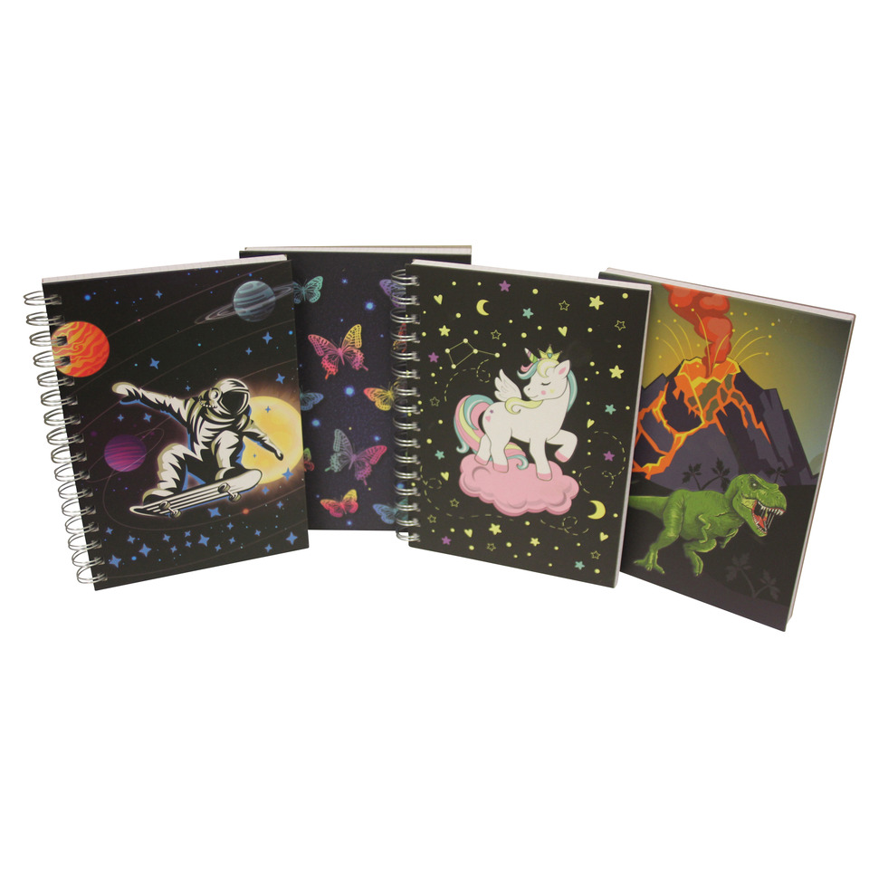 Spiralnotizbuch nachtleuchtend, Größe A5, Deckblatt mit phosphoriszierendem Druck, 4 Motive sortiert, 96 Blatt, kariert, 80g/m². Doppelspirale silber links. Größe BxH 14,8x21cm