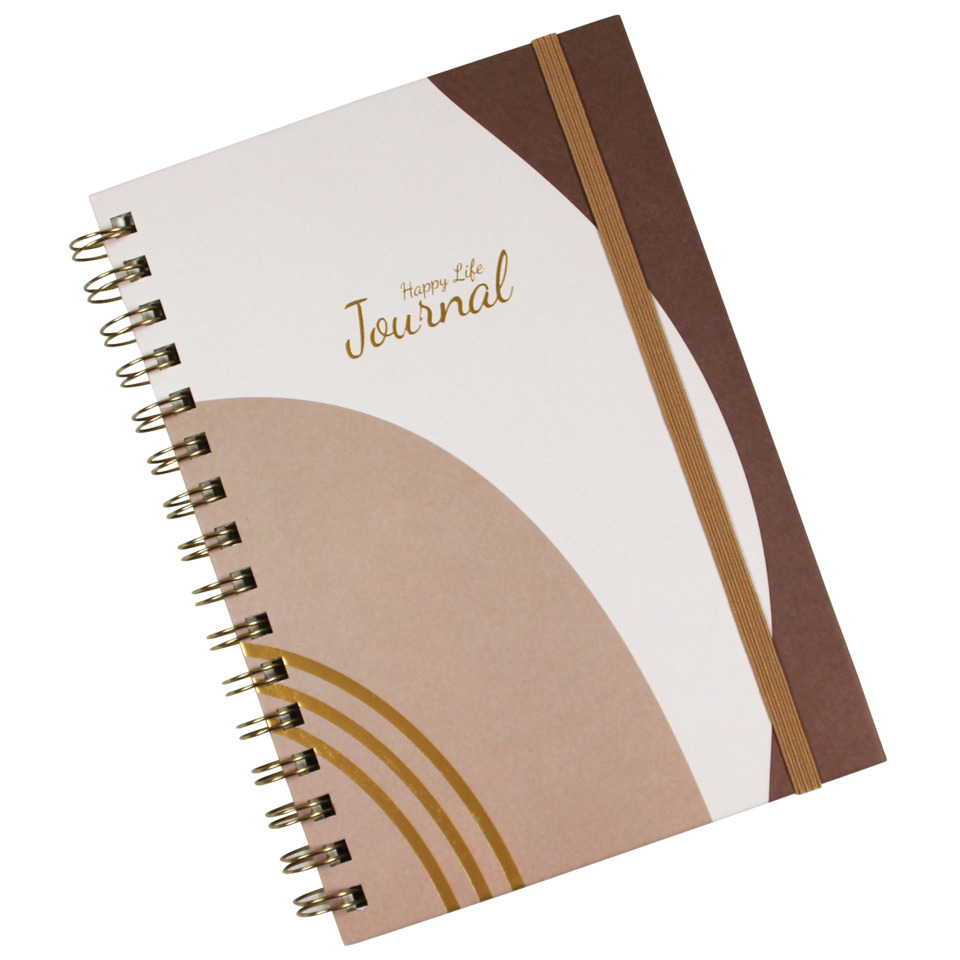Format ca. DIN A5, stabiler Kartoneinband, Papier: 100 Blatt, cremefarben, liniert, 80g/m². Mit Elastikband und Archivtasche, Spirale links goldfarben, Größe BxH 14,8x21cm