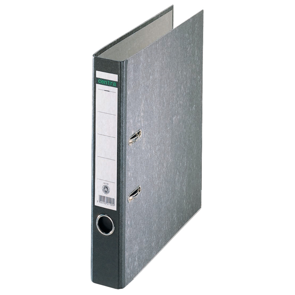 Ordner Standard, mit Hebelmechnik. Mit Schlitzen, mit Griffloch, mit Kantenschutz, mit aufgeklebtem Rückenschild. Material: Einband aus Pappe (RC), mit Wolkenmarmor-Papier kaschiert. Format: für A4, 317 x 285 mm, Rückenbreite: 52 mm. Farbe: schwarz.