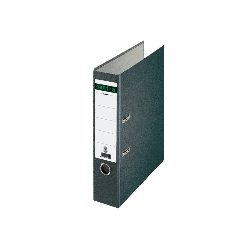 Ordner Standard, mit Hebelmechnik. Mit Schlitzen, mit Griffloch, mit Kantenschutz, mit aufgeklebtem Rückenschild. Material: Einband aus Pappe (RC), mit Wolkenmarmor-Papier kaschiert. Format: für A4, 317 x 285 mm, Rückenbreite: 80 mm. Farbe: schwarz.